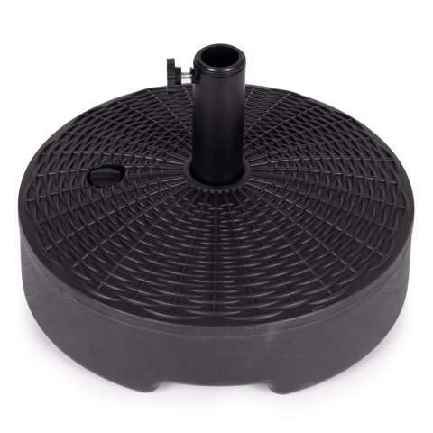 W górnej części podstawy znajduje się odkręcany korek, po jego wykręceniu należy napełnić podstawę wodą. Obciążenie będzie ważyć wtedy ok. 22 kg, co zapewni idealną stabilizacjęparasola.